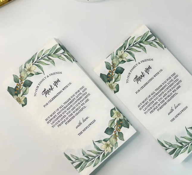 Bilo da se radi o rođendanskoj zabavi, tematskom vjenčanju ili događaju korporativnog brendiranja, prilagođena tiskana tkiva savršeno nadopunjuju temu i shemu boja događaja. Zamislite izvrsnu postavku stola, svako tkivo utisnuto logotipom para, korporativnim sloganom ili svečanom motivom - ova vrsta promišljene pozornosti na detalje odmah pokazuje predanost organizatora kvaliteti. To ne samo da pruža pogodnost gostima, već i suptilno pojačava temu događaja.